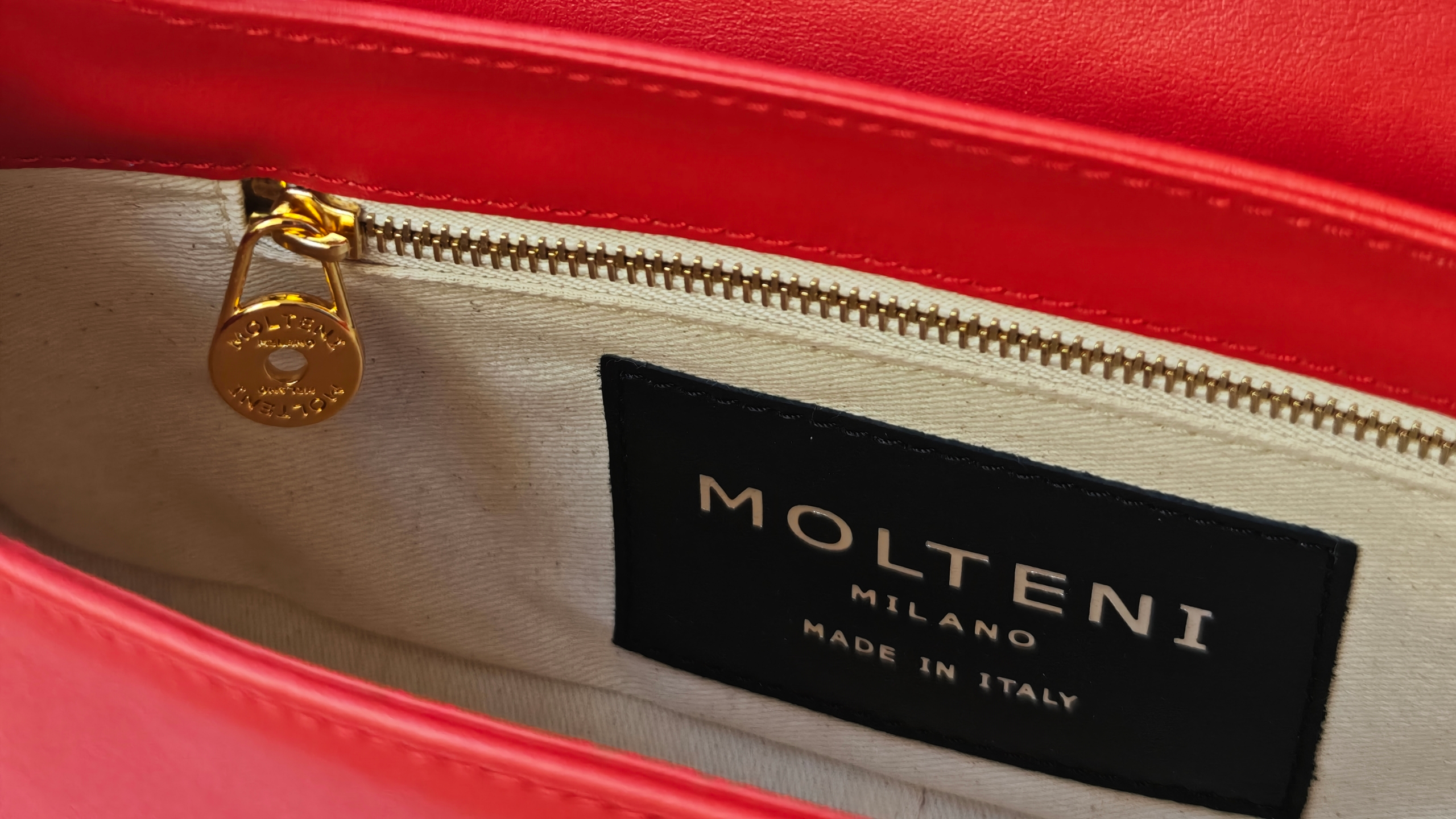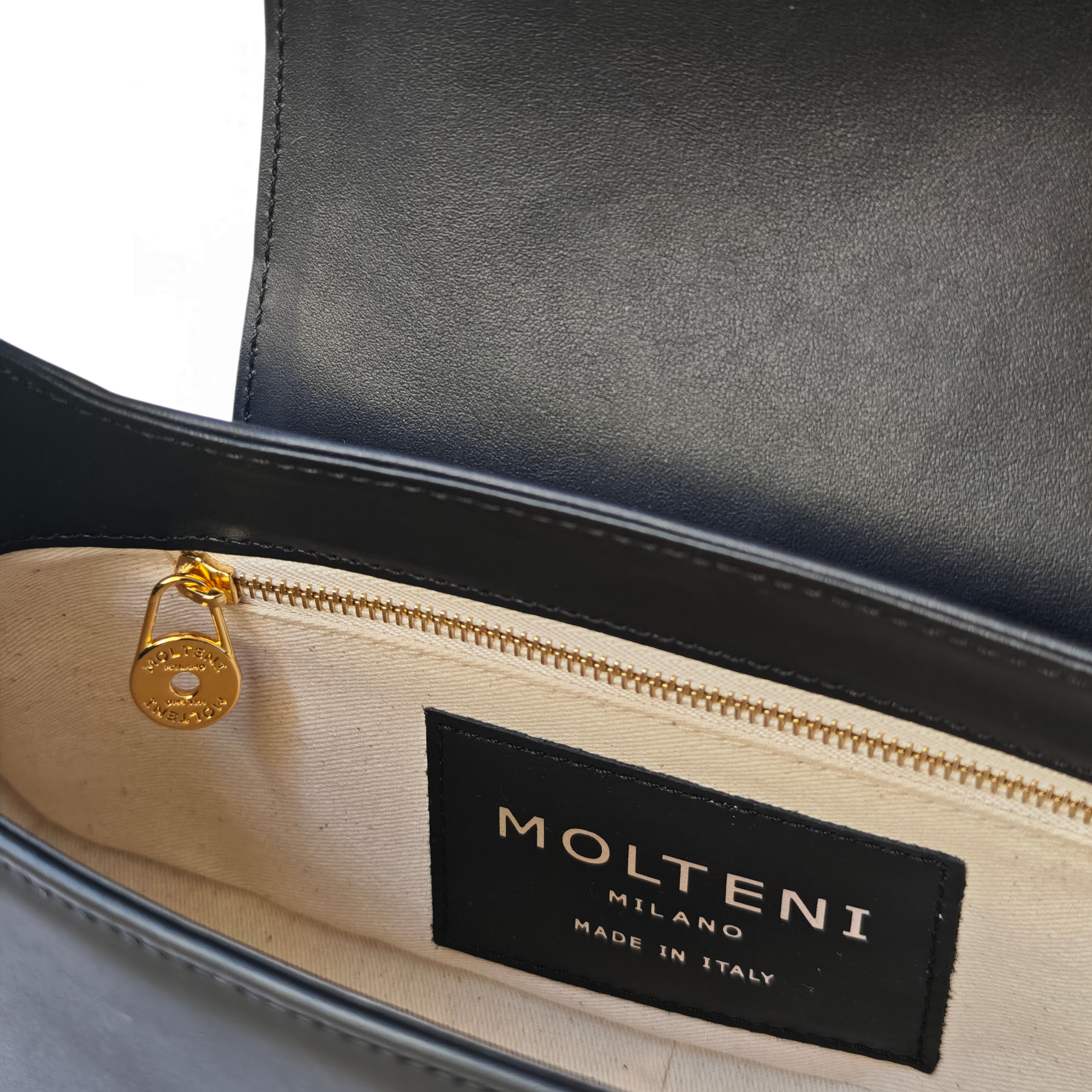 La patch interna in pelle nera è impreziosita dal logo MOLTENI MILANO in lamina d’argento, un dettaglio che sottolinea l’artigianalità e l’eleganza discreta del modello.